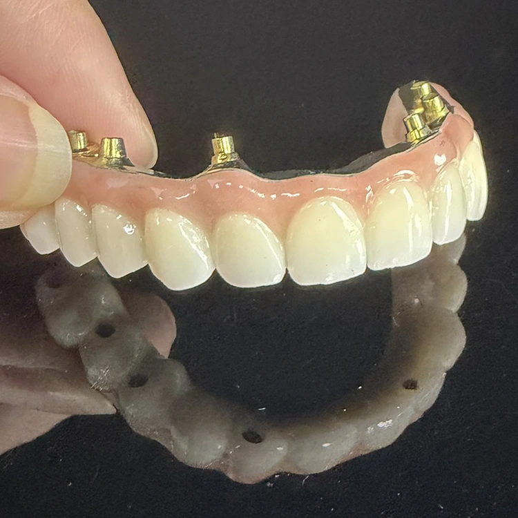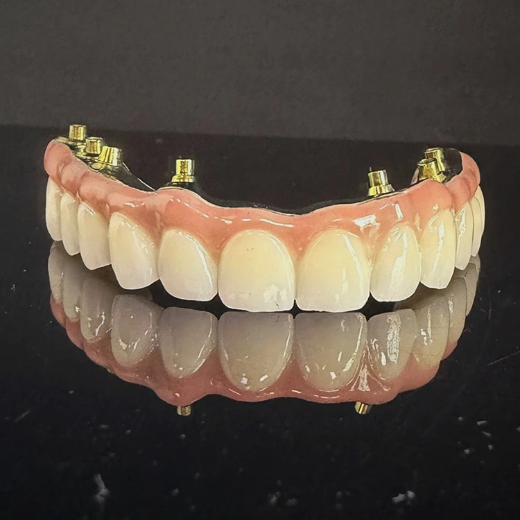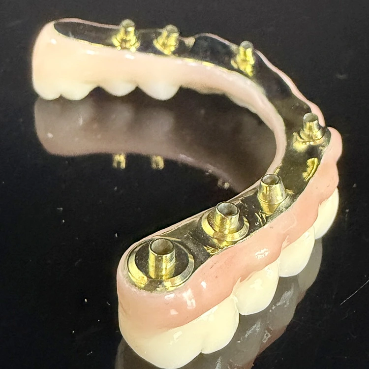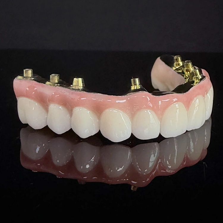 Full-arch hybrid all on 6 zirconia bridge over titanium dental bar, Full milled zirconia and full milled titanium bar with aesthetic pink gum from China dental lab WM Dental lab
